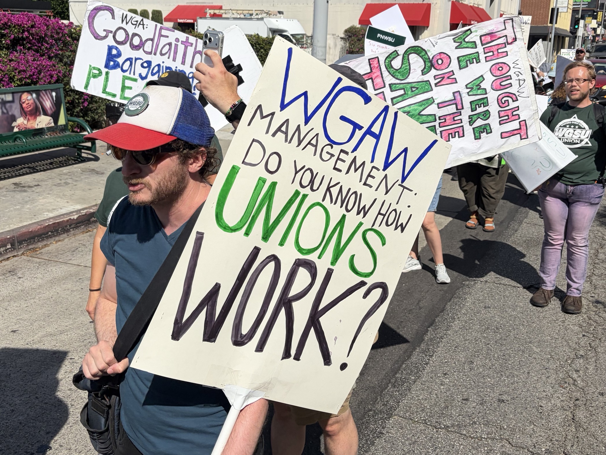 The Writers Guild Staff Union began picketing on the sidewalk outside the SAG-AFTRA headquarters on Wilshire Blvd. around noon after getting word that bargaining between the WGA and the Alliance of Motion Picture and Television Producers (AMPTP) was starting there.